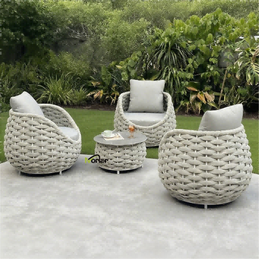 4.Σχοινί Εξωτερικός Καναπές: Ο σχεδιασμός με σχοινί με πλεκτό χέρι είναι οπτικά ελαφρύς και αναπνέει, και το πλαίσιο αλουμινίου προσθέτει μια μοντέρνα πινελιά. Συνδυάζοντας άνεση και τέχνη, είναι μια δημοφιλής επιλογή για τη δημιουργία ενός εκλεπτυσμένου μπαλκονιού.