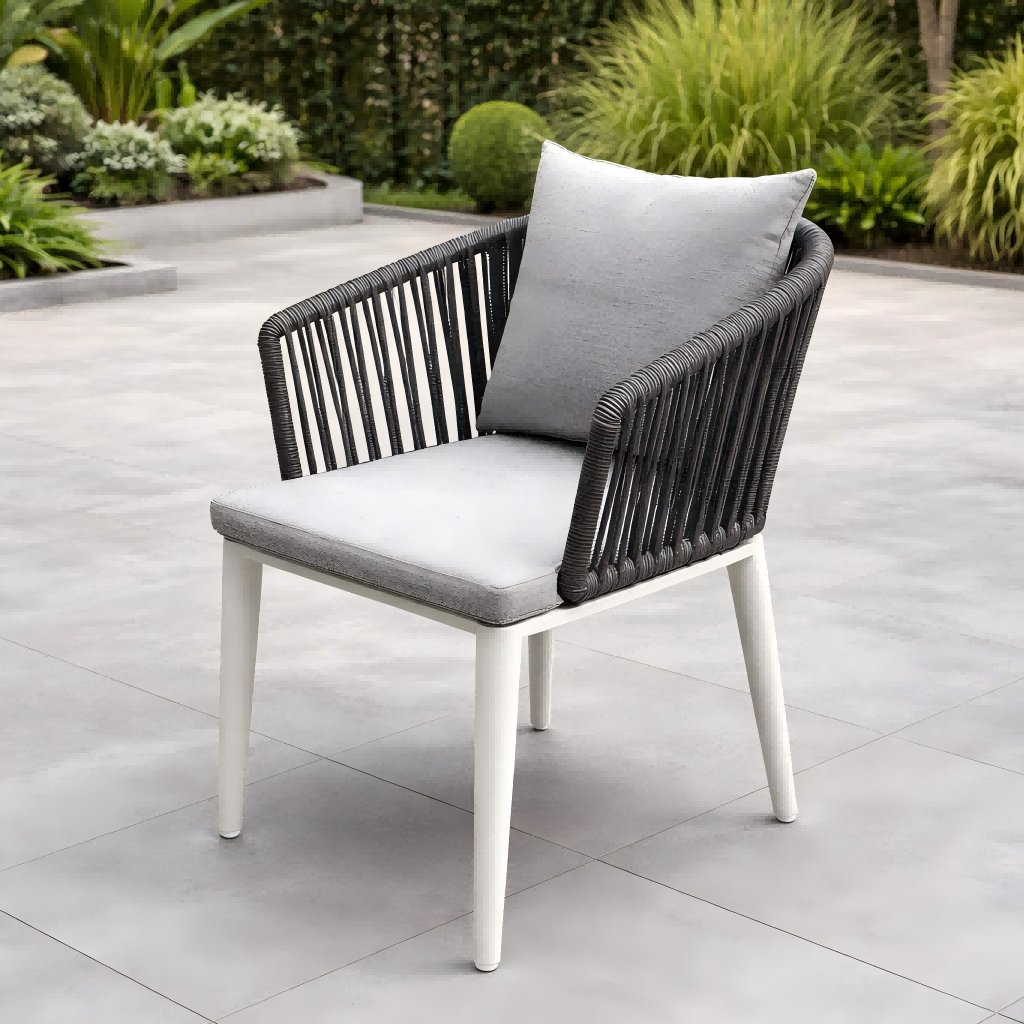 Οι καρέκλες τραπεζαρίας διαθέτουν πλάτη από σχοινί, δημιουργώντας μια μοντέρνα και κομψή εμφάνιση ενώ παρέχουν άνετη στήριξη. Το πλαίσιο είναι κατασκευασμένο από αλουμίνιο με επίστρωση πούδρας, το οποίο προσφέρει εξαιρετική αντοχή στη σκουριά και στις εξωτερικές καιρικές συνθήκες.